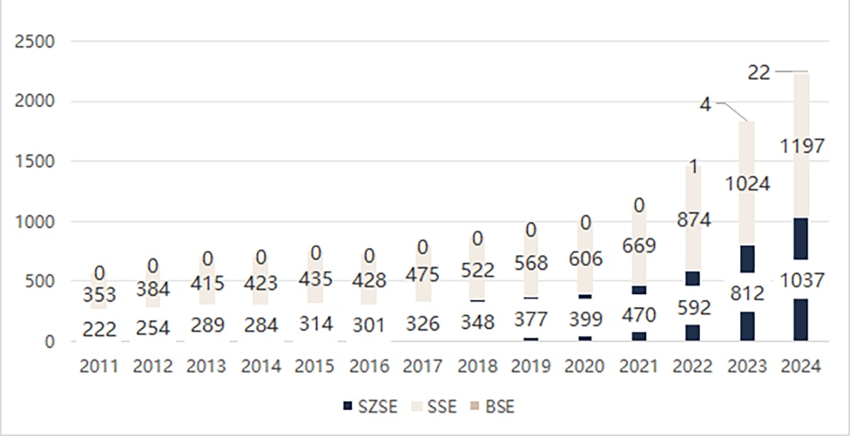 Figure 3 Between 2011 and 2024 there was a major rise in the number of listed companies that published ESG reports in the Shenzhen Stock Exchange (SZSE), Shanghai Stock Exchange (SSE), and Beijing Stock Exchange (BSE) (Source: Syntao)