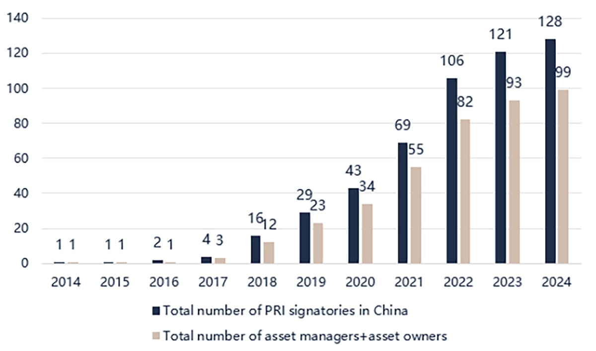 The introduction of China’s “dual-carbon” goals - aiming to achieve peak carbon emissions by 2030 and carbon neutrality by 2060 - has spurred growing interest in ESG investments among financial institutions. This shift is evident in the near tripling of Principles for Responsible Investment (PRI) signatories in mainland China, rising from 43 in 2020 to 128 in 2024. Notably, the number of asset managers and owners committing to PRI grew from 34 to 99 during this period, reflecting an annual growth rate of 30.63%.